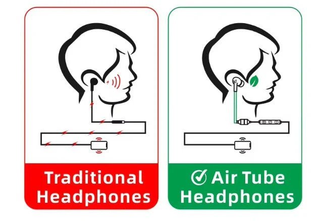 AirTube headsets were created to cut down close-range EMF exposure around the head while still letting you use your phone in a normal way. Instead of placing a tiny loudspeaker and wiring a few millimetres from your ear canal, the iBrain FC08 keeps the speakers further down the cable and sends sound to your ears through hollow air tubes.