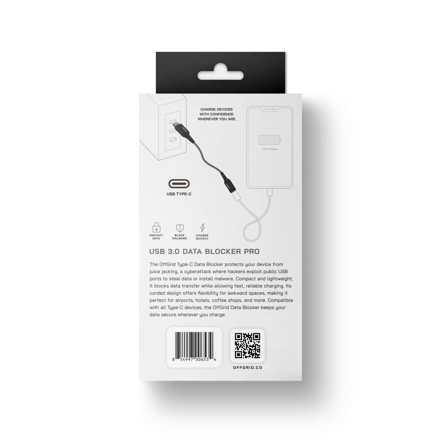 Compact and lightweight, it blocks data transfer while allowing fast, reliable charging. Its corded design offers flexibility for awkward spaces, making it perfect for airports, hotels, coffee shops, and more. Compatible with all Type-C devices, the OffGrid Data Blocker keeps your data secure wherever you charge.